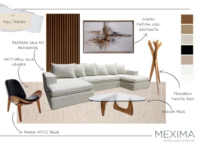 Este moodboard de tendencias otoñales articula una sala contemporánea donde la calidez de la madera y los tonos neutros crean un equilibrio sofisticado. Un sofá modular en beige suave se convierte en el eje del espacio, respaldado por un panelado vertical de madera que aporta ritmo y textura. Sobre él, una pintura abstracta al óleo en matices tierra y negro introduce profundidad artística, mientras la alfombra clara unifica la composición con un gesto acogedor y sereno.
